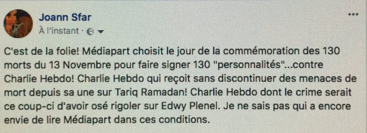Télescopage terrible. Il y a deux ans, 130 personnes étaient assassinées au nom de ...rien. Mais les vrais héros sont les 130 soutiens de Plenel et Mediapart. Parce que le vrai danger, c’est Charlie bien sûr.pic.twitter.com/NvwstM8X6O