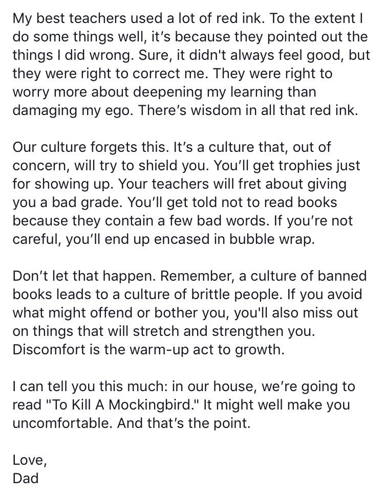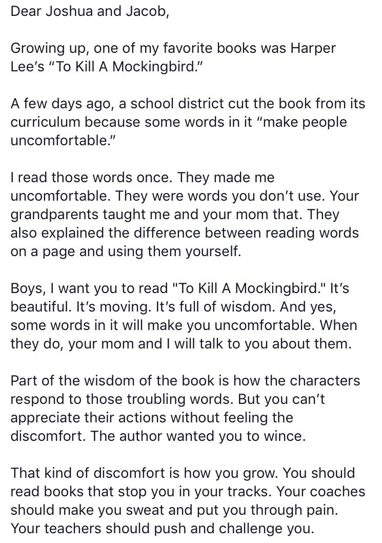 "To Kill A Mockingbird" was cut from a school's curriculum because words in it made people uncomfortable. Discomfort is the point.pic.twitter.com/Jpq3x0zZu2