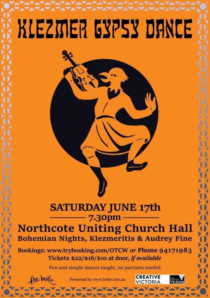 @BoiteMusic , Bohemian Nights, Klezmeritis @ Northcote Uniting Church Hall. http://www.Trybooking.com/OTCW pic.twitter.com/zzQhqihGQF