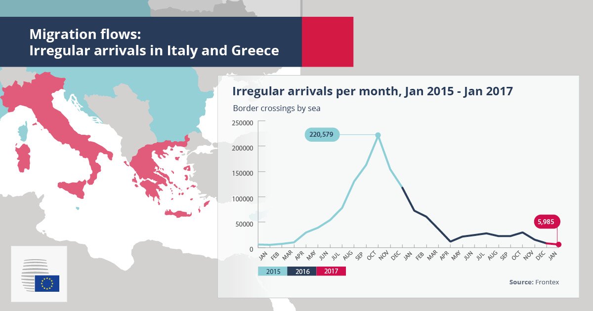 Flows of irreg.migrants into EU decreased. EU to keep working w/ partners to stem flows on central med. route