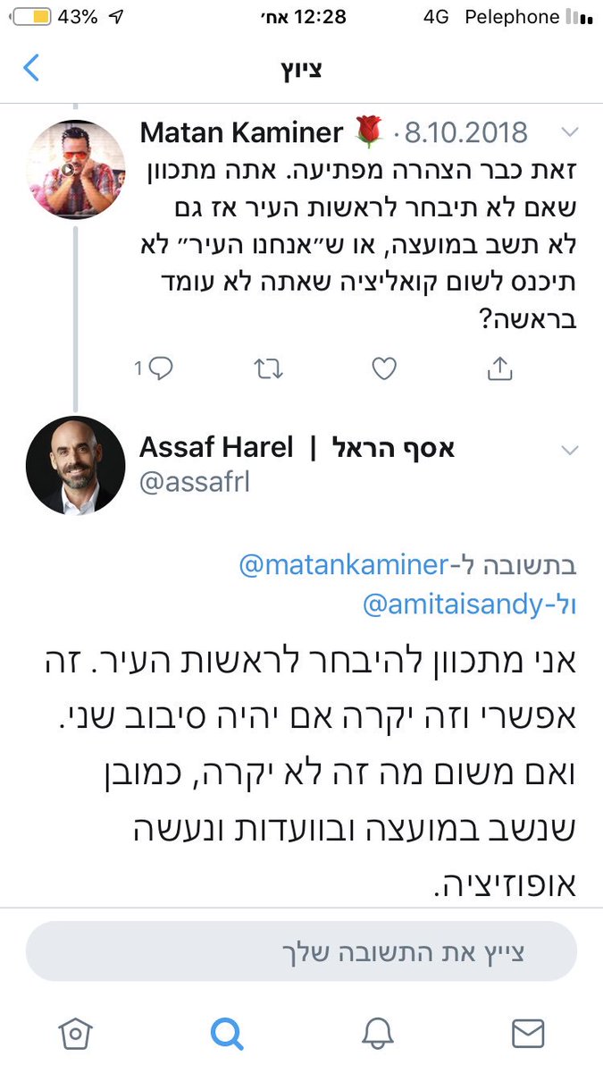 יום מיליטנטי יקיריי הטוויטריסטים. בא לו מיסטר דודו פארוק ומכריז קבל עם ועדה שהוא מתכוון לרוץ לראשות הממשלה. אתם אולי רואים פה ריצה לגיטימית, אני רואה פה ניסיון לפוטש מתועב, קריאת תיגר וחתירה שרלטנית תחת שלטוני הקרב ובא. שמעו נא טוויטריסטיי, על גופתי המתה - לא יקום ולא יהיה.