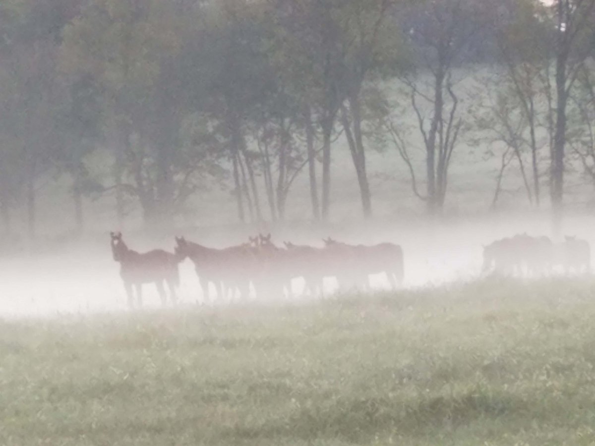 Thoroughbred weanlings coming out of the Kentucky mist...
