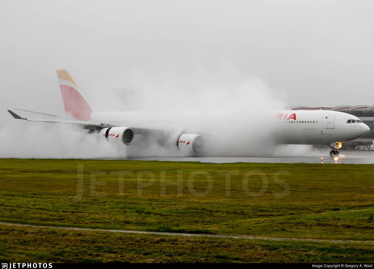 An Iberia A340 going full reverse thrust while landing on a rain-soaked runway in San Jose. https://www.jetphotos.com/photo/8648139 © Gregory A. Waidpic.twitter.com/ckzc11bBLS