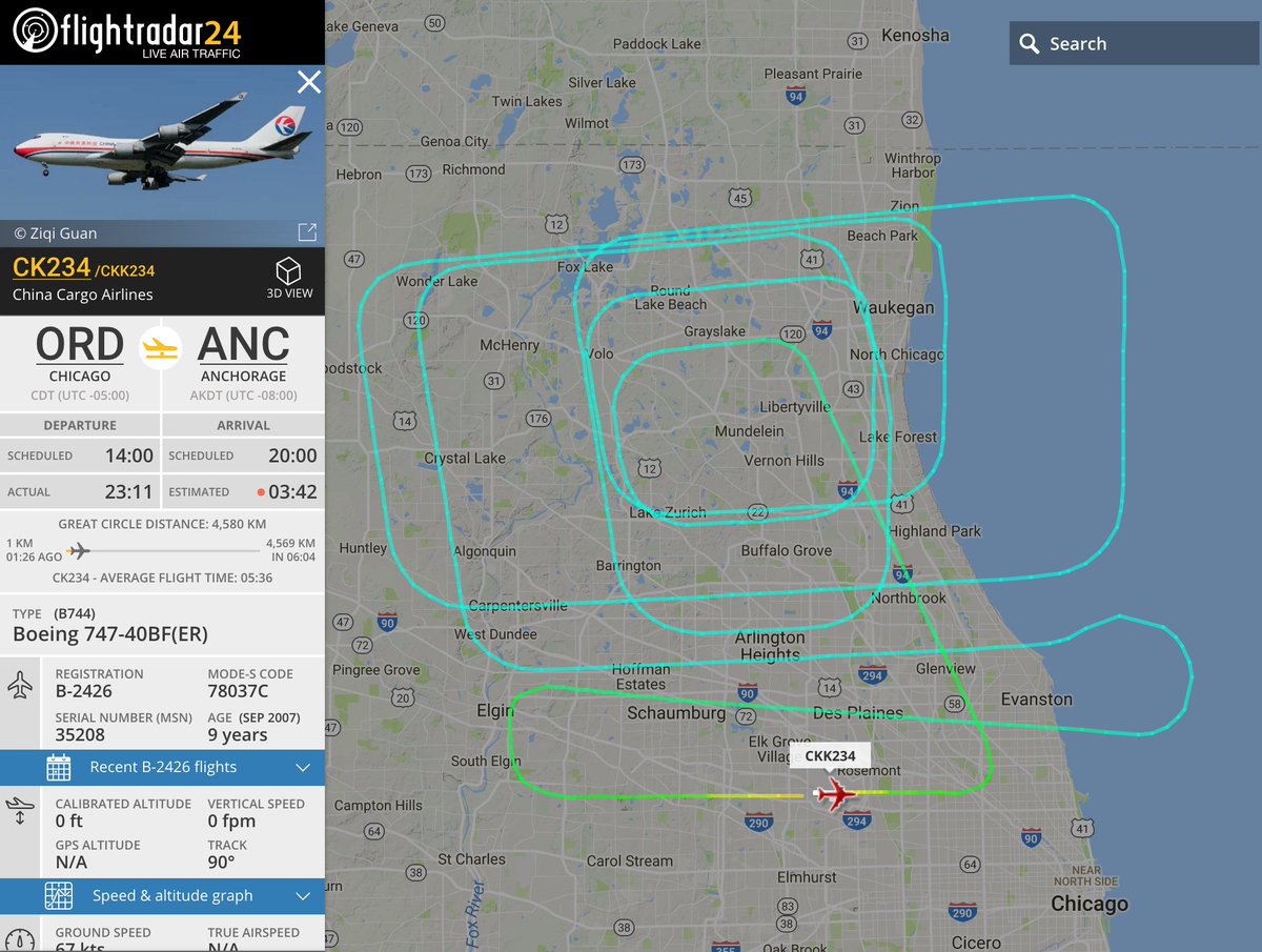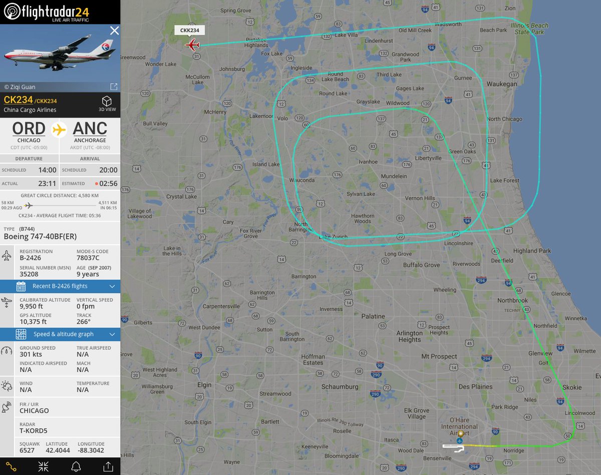 #CK234, Chicago-Anchorage, dumping fuel prior to return to Chicago due to number 3 engine issue. https://www.flightradar24.com/CKK234/e2c5096 pic.twitter.com/7wDN3dU5cS