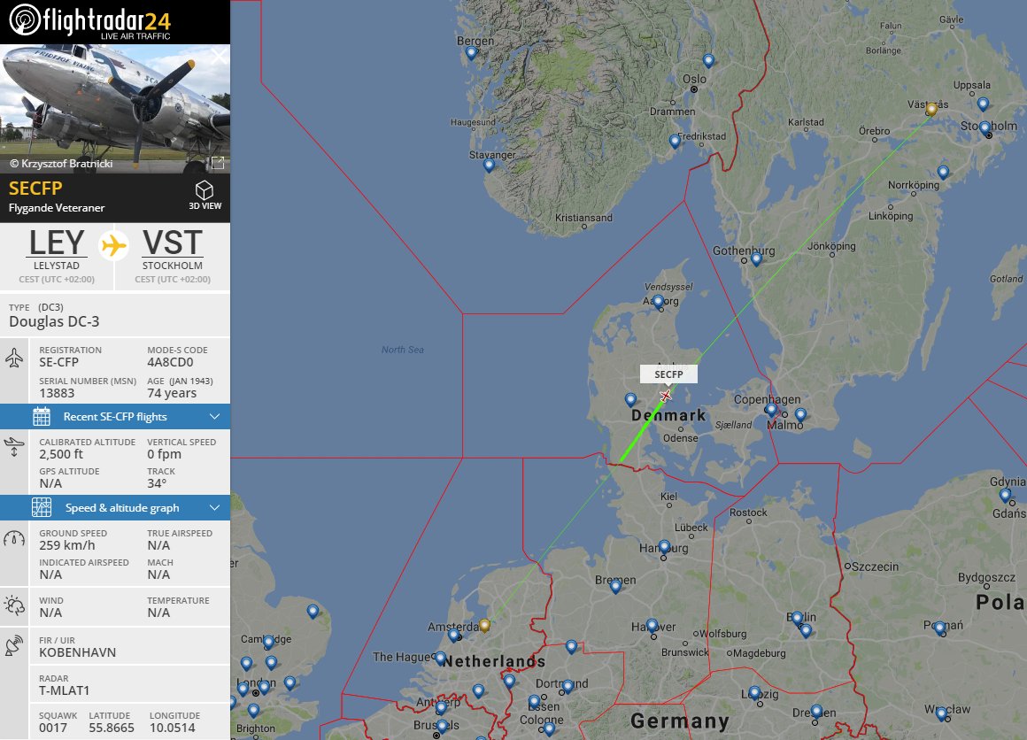 DC3 "Flying Daisy" is returning to base in Sweden after an engine change in Lelystad, Netherlands https://www.flightradar24.com/SECFP/e2e1108 pic.twitter.com/bzjZFHo1SB