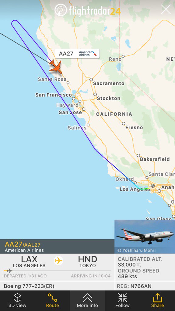 #AA27, Los Angeles to Tokyo, returning to LAX due to technical issue preventing ETOPS. https://fr24.com/AAL27/e2e37bd pic.twitter.com/USj2ElwyvJ