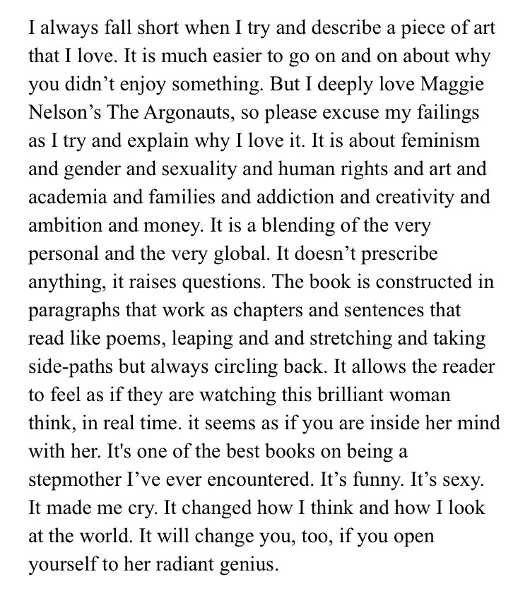 our next read is ‘The Argonauts’ by Maggie Nelson, recommended by Greta Gerwig! Read what Greta has to saypic.twitter.com/Fuzx1bHfW1