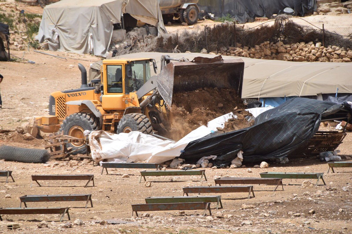 היום, 2.5.18, בשעה 7:30 בבוקר, הגיעו שני ג'יפים של המנהל האזרחי, מלווים בעשרות חיילים ושני דחפורים, לארבע קהילות פלסטיניות סמוכות באזור מסאפר יטא שבדרום הר חברון - ח'ירבת ג'ינבה, ח'ירבת אל-מרכז, ח'ירבת אל-חלאווה וח'ירבת אל-פח'ית.>>>>