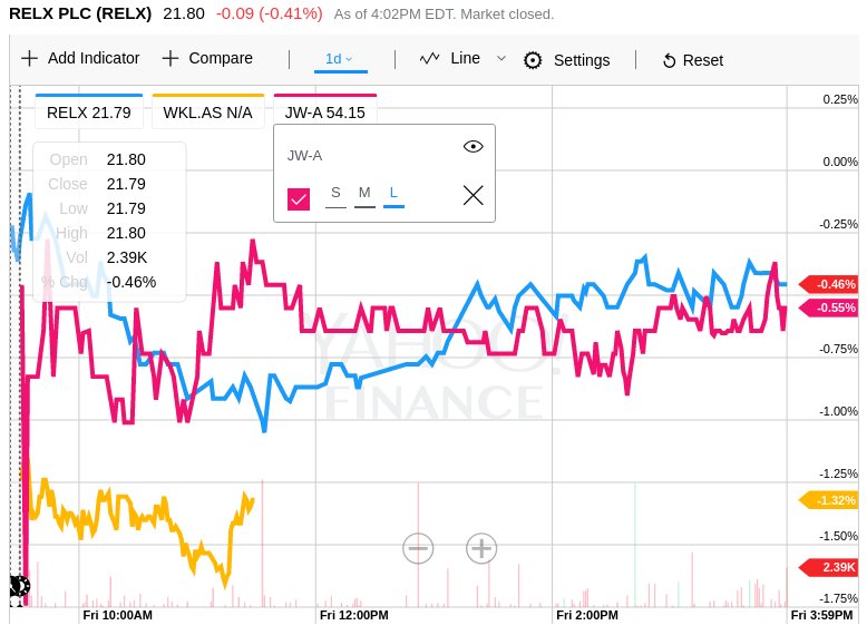 $RELX,$JW.A &$WKL all down since yesterday's close. Difficult to attribute causality. https://finance.yahoo.com/chart/RELX#eyJjb21wYXJpc29ucyI6IldLTC5BUyxKVy1BIiwiY29tcGFyaXNvbnNDb2xvcnMiOiIjZmZiNzAwLCNmMDEyNmYiLCJjb21wYXJpc29uc0dob3N0aW5nIjoiMCwwIiwiY29tcGFyaXNvbnNXaWR0aHMiOiI0LDQiLCJzaG93QXJlYSI6ZmFsc2UsIm11bHRpQ29sb3JMaW5lIjpmYWxzZSwibGluZVdpZHRoIjoiNCIsImJvbGxpbmdlclVwcGVyQ29sb3IiOiIjZTIwMDgxIiwiYm9sbGluZ2VyTG93ZXJDb2xvciI6IiM5NTUyZmYiLCJtZmlMaW5lQ29sb3IiOiIjNDVlM2ZmIiwibWFjZERpdmVyZ2VuY2VDb2xvciI6IiNmZjdiMTIiLCJtYWNkTWFjZENvbG9yIjoiIzc4N2Q4MiIsIm1hY2RTaWduYWxDb2xvciI6IiMwMDAwMDAiLCJyc2lMaW5lQ29sb3IiOiIjZmZiNzAwIiwic3RvY2hLTGluZUNvbG9yIjoiI2ZmYjcwMCIsInN0b2NoRExpbmVDb2xvciI6IiM0NWUzZmYiLCJsaW5lVHlwZSI6ImxpbmUiLCJyYW5nZSI6IjFkIn0%3D …pic.twitter.com/aBR6zj1zd2