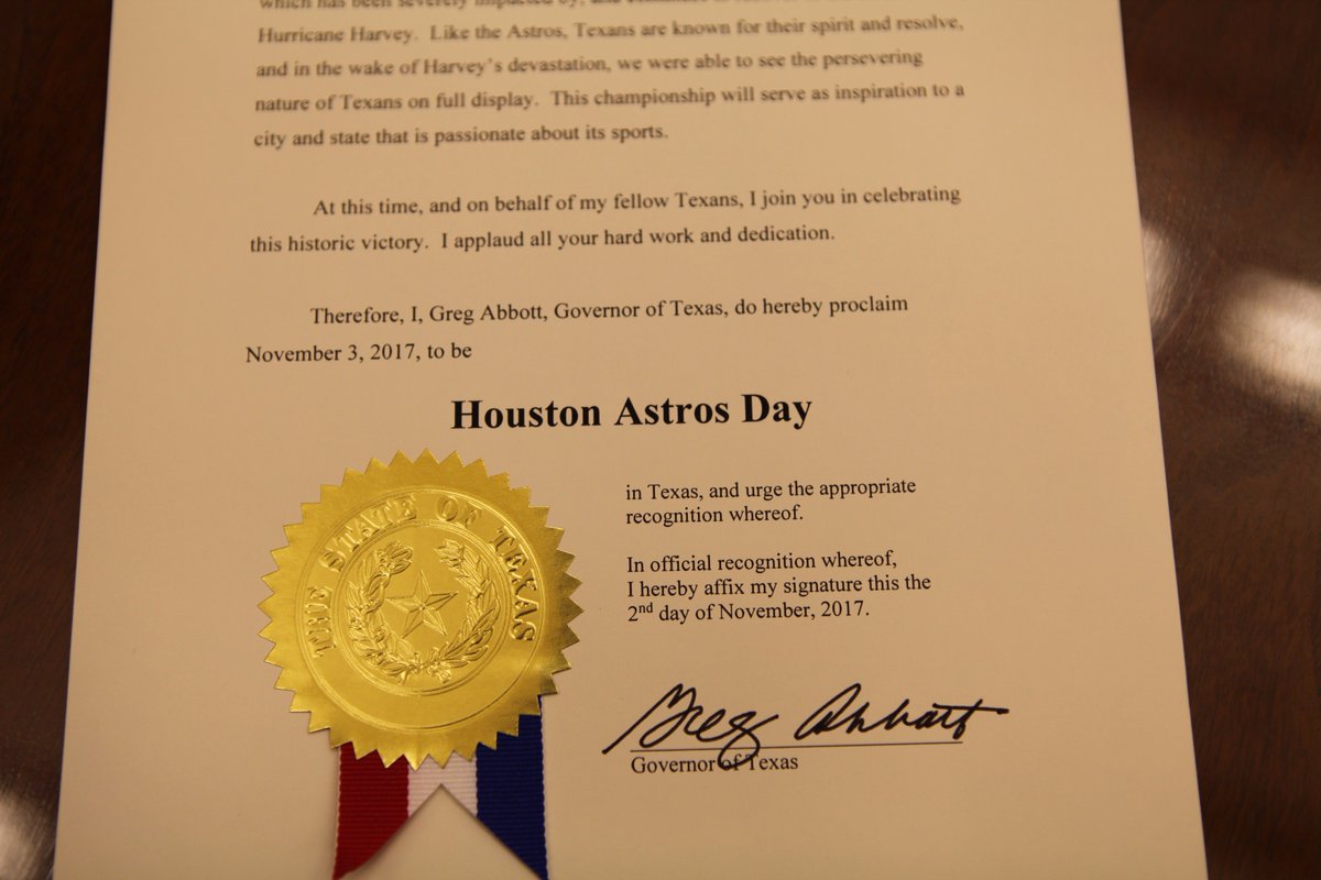 November 3, 2017 has been proclaimed Houston Astros Day in Texas. Congratulations to the World Series Champions