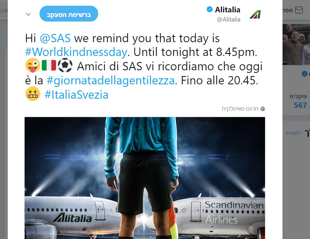 גם באליטליה מוכנים למשחק הערב (ועל הדרך מבקשים טובה קטנה מחברת התעופה של סקנדינביה)pic.twitter.com/wEvH2IG6d7