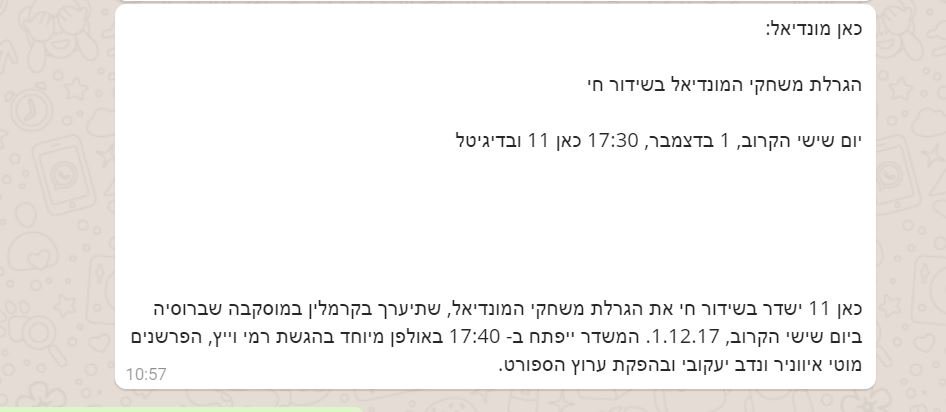 @kann, על פי כל האתרים בעולם ההגרלה אמורה להתחיל בשעה 18:00 שעון מוסקבה - שזה אומר 17:00 בשעון ישראל. נראלי נפלה לכם איזה טעות בהודעה שהוצאתם (:pic.twitter.com/5WLdtylfsy