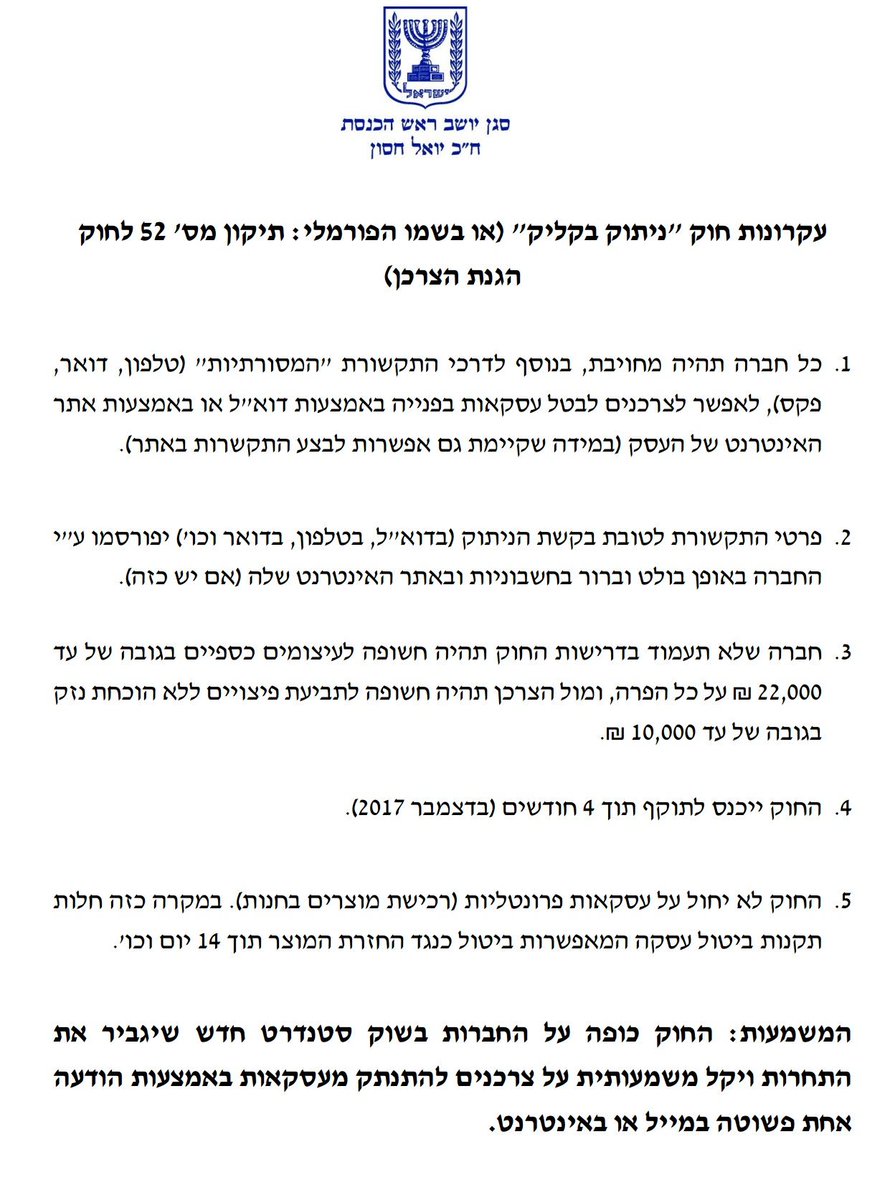 רבים שואלים על חוק "ניתוק בקליק" שהעברתי הערב.אני מצרף בתמונה את עקרונות החוק.ו...יאללה אפשר להתחבר ולא לפחד שלא ננותק.pic.twitter.com/LNnGk4JNZu