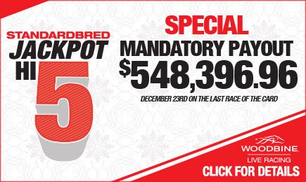 @WoodbineRacing. Race 12 is the Jackpot Hi-5 Manadatory Payout race. Field of 12 pacers to compete in Hi-5 race.