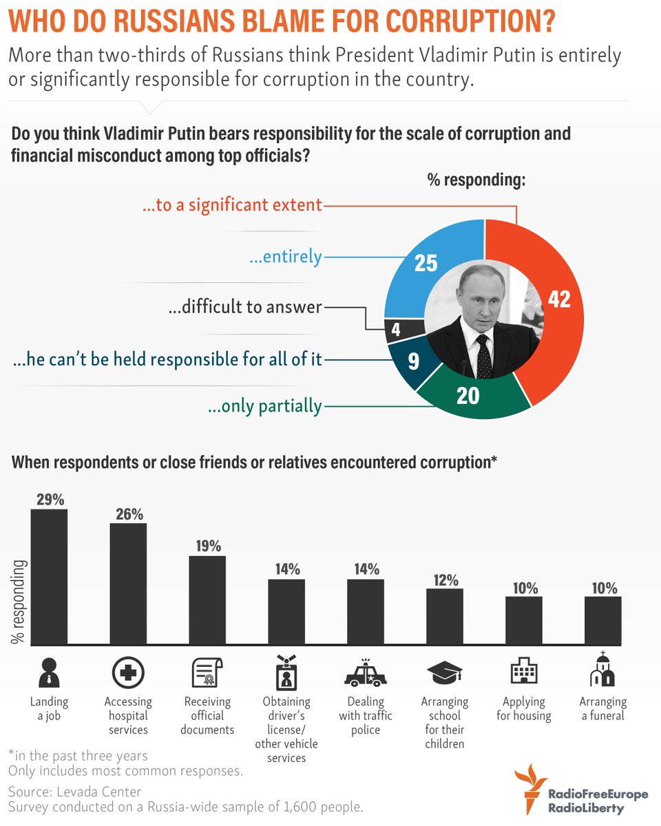 More than 2/3 of Russians think that Putin is entirely or significantly responsible for corruption in the country.