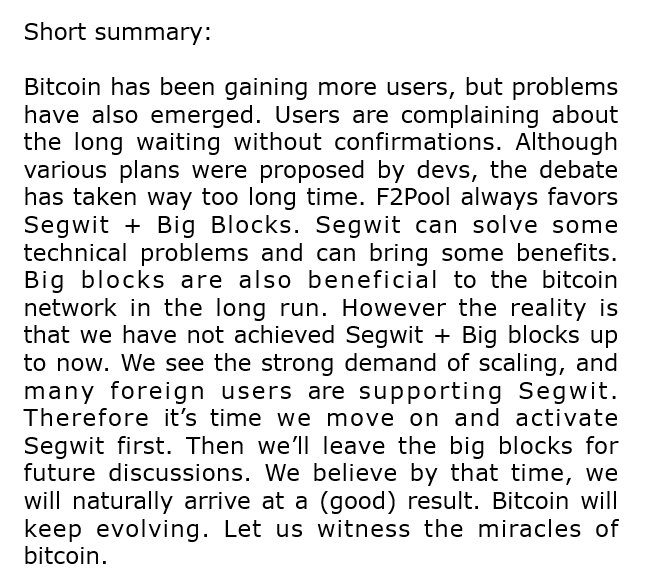 Short summary of F2Pool's announcement about supporting Segwit on