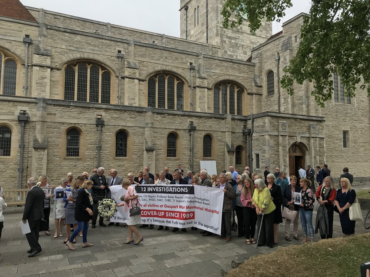 Relatives of patients at the Gosport War Memorial Hospital step out of Portsmouth Cathedral, facing the world for the first time since reading the independent report