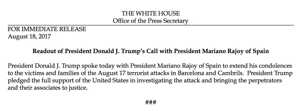 NEW: President Trump spoke with President Rajoy of Spain to "extend his condolences to the victims and families” of the terrorist attacks.pic.twitter.com/WWlaYIFKwk