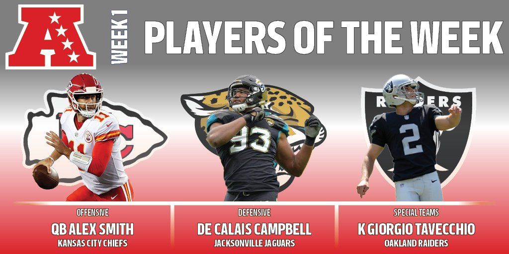 AFC Players of Week 1 Offense: Alex Smith, KC Defense: Calais Campbell, Jax Special Teams: Giorgio Tavecchio, Oakpic.twitter.com/z7ODrKeWpr