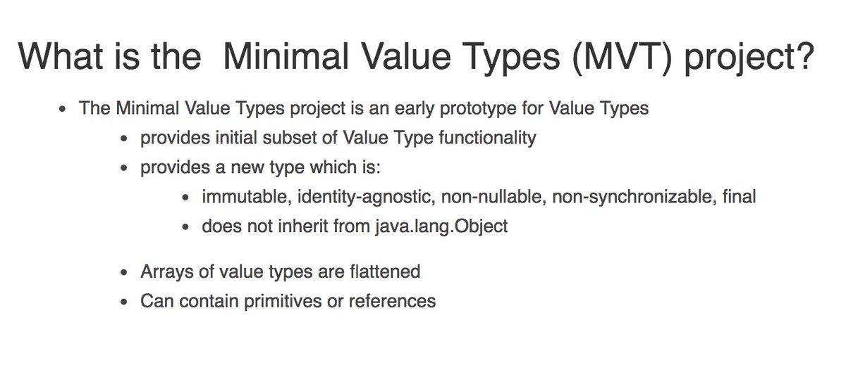#Valhalla Minimal Value Types (MVT) Test "Value Types" implementation within the JVM without the introduction of language features http://jdk.java.net/valhalla/ pic.twitter.com/fq1eQMIdcD