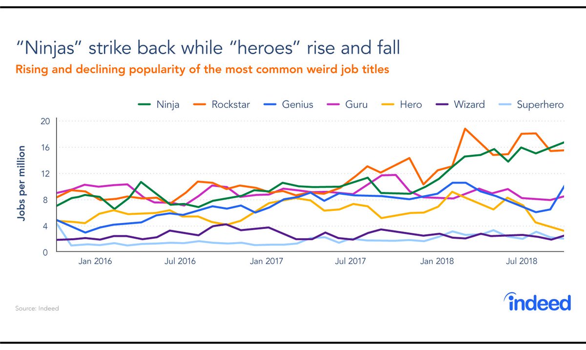 Ninjas rise. Gurus hold steady. Heroes fall. Weird Job Titles 2018: The Year in Review http://blog.indeed.com/2018/12/14/weird-job-titles-year-in-review/ …pic.twitter.com/zzf9GdGDo6