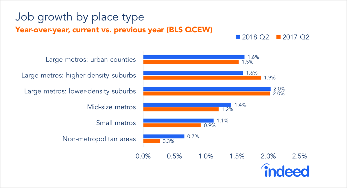 Outer suburbs still have the fastest job growth. An important gap is narrowing a bit: job growth accelerated in rural areas. New BLS QCEW for 2018 Q2.pic.twitter.com/TwFGGsncK9