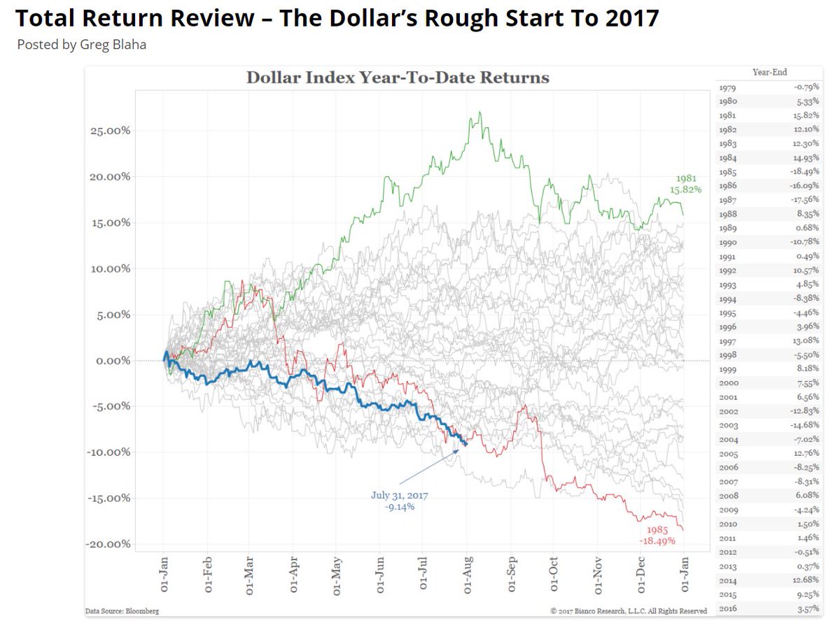The USD is off to its worst start since 1985. What this means for TIPS and gold: by