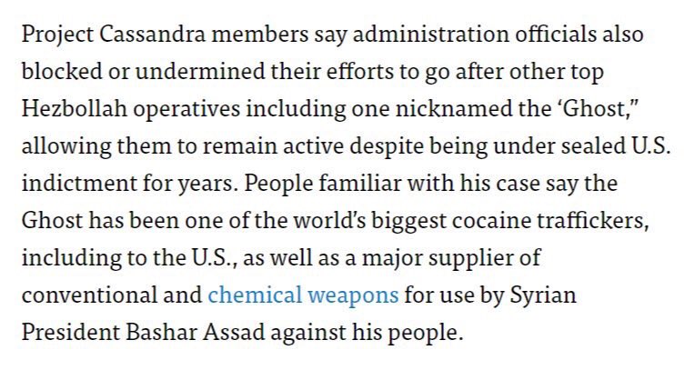 @JoshMeyerDC story: Obama admin blocked efforts to go after top Hezbollah operative — one of world’s biggest cocaine traffickers & major supplier of chemical weapons to Assad.pic.twitter.com/yzQRicrb21
