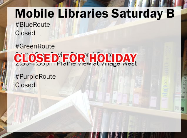 1. Due to inclement weather, the library will be closed Sunday, January 15th.