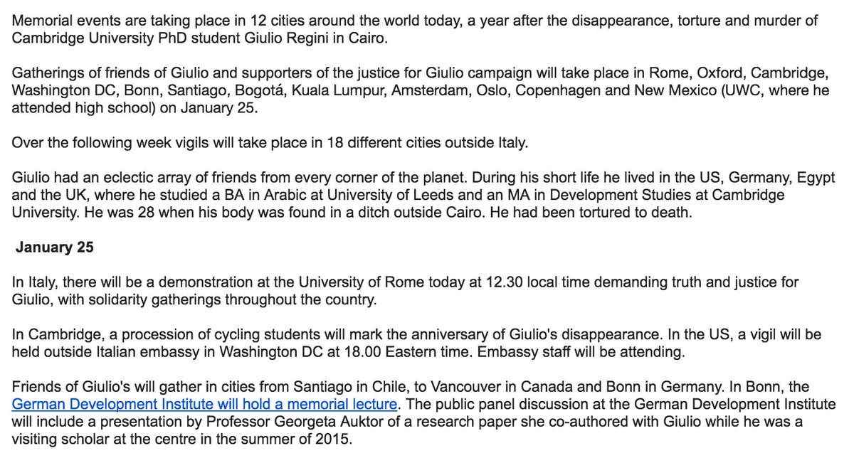 Memorial events taking place in 12 cities globally one year after student Giulio Regeni's disappearance in Egypt. Statement from friends:pic.twitter.com/3pQzT4FuAn