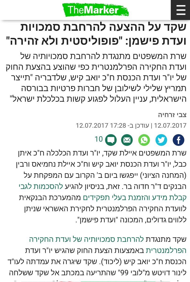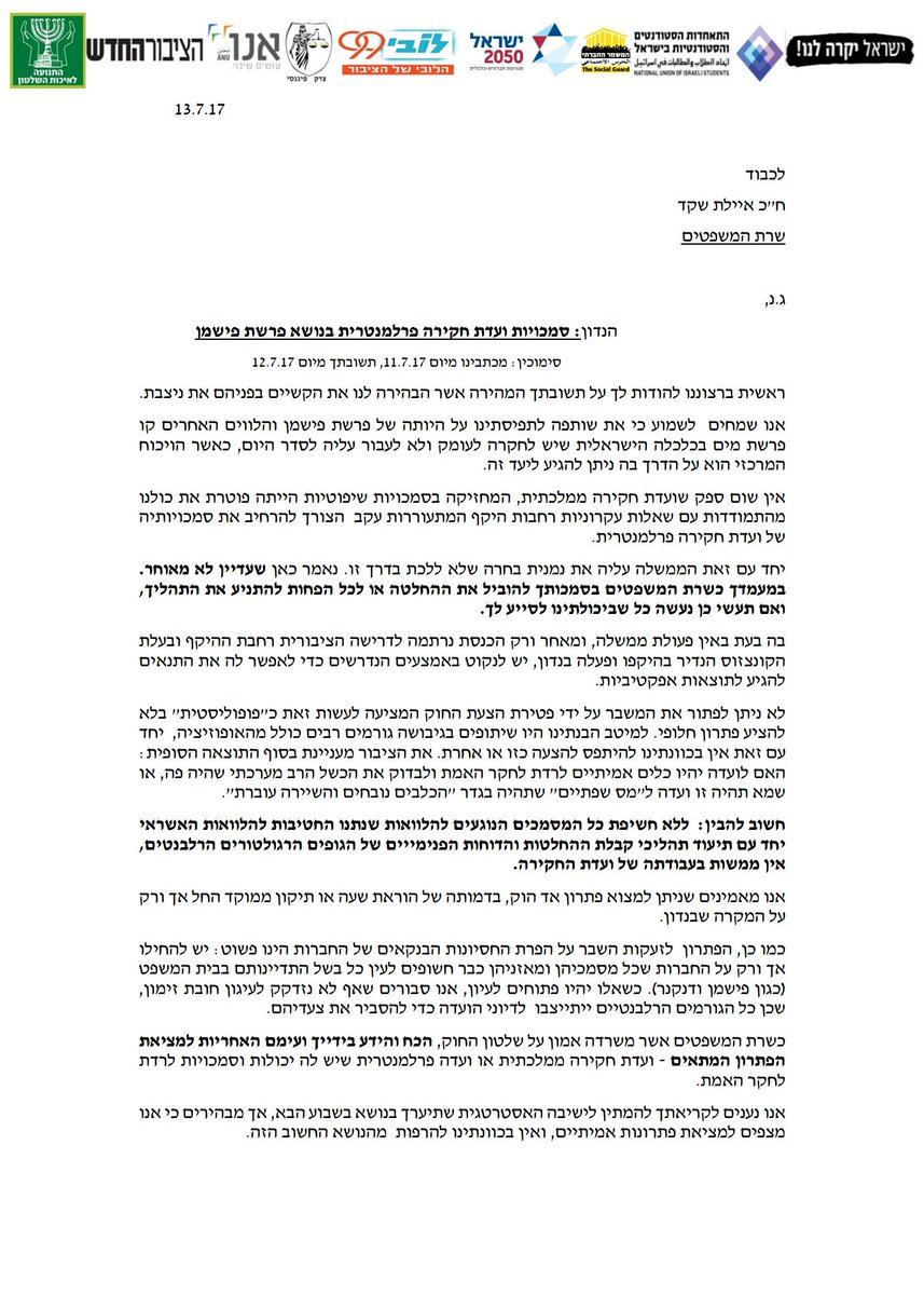 מכתב דחוף שהוצאנו ל על התנגדותה למתן שיניים לועדת החקירה הפרלמנטרית על מתן האשראי לפישמן, כעשרה ארגונים הצטרפו.
