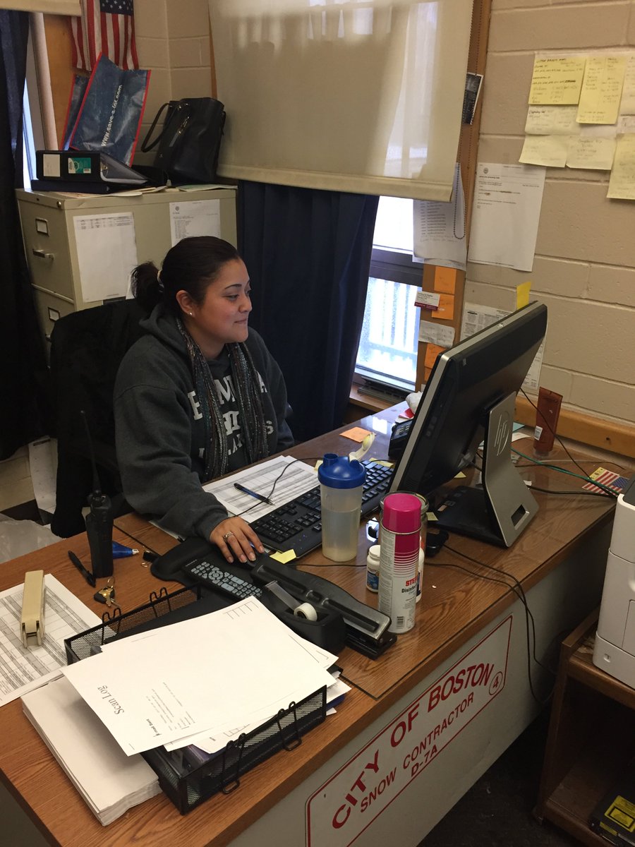 Cathy monitors snow plow activity in Dorchester via GPS, radio and phone. She’s 1 of 13 snow clerks citywide. handles .