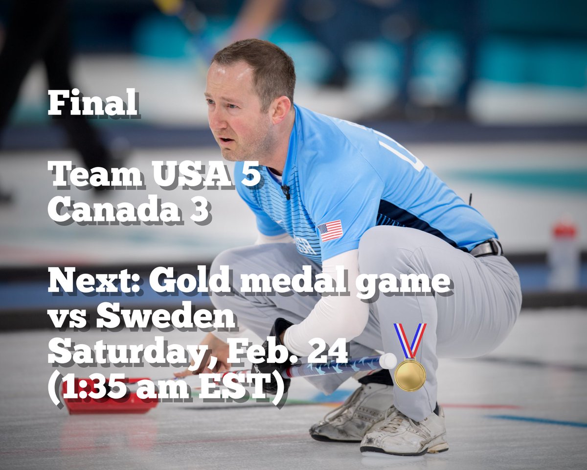 #TeamShuster vs Canada tomorrow morning (6:05 am EST). Winner plays for gold.#PyeongChang2018