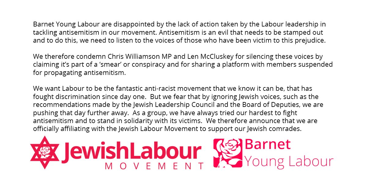 Barnet Young Labour statement on the lack of action by the Labour leadership to tackle antisemitism.pic.twitter.com/hrGNBcwqZD