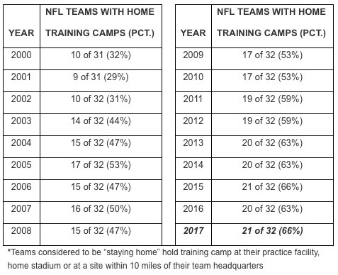 Here’s a look at the number of teams that stayed home for training camp since 2000: