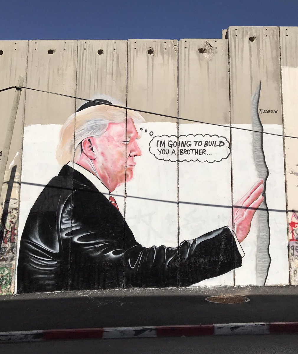 Trump portrait appears on separation wall, credited to Australian street artisthttp://mondoweiss.net/2017/07/portrait-separation-australian/ …