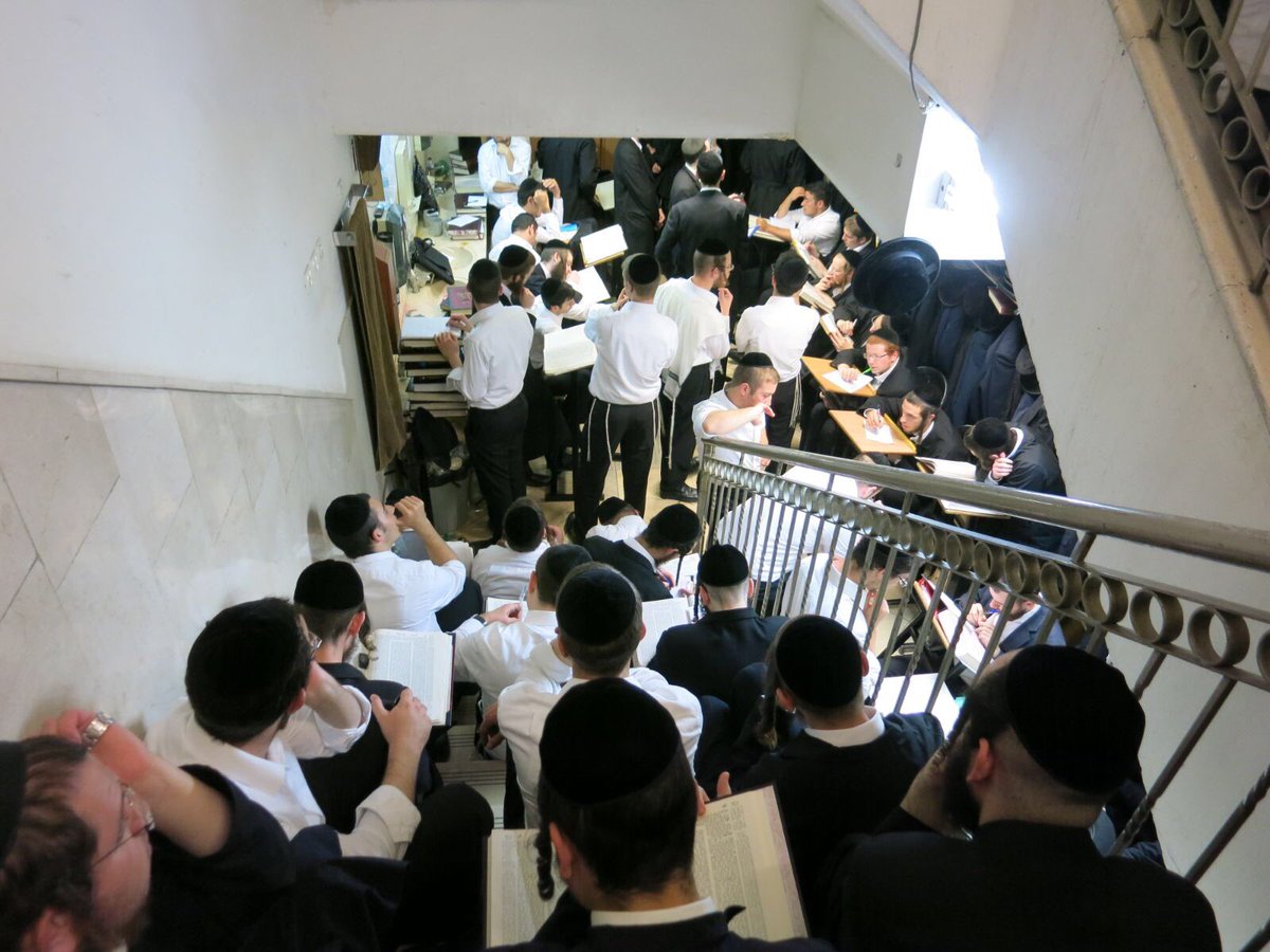 אלול תשע״ז בישיבת מיר. צימאון אדיר לתורה. 650 איש מצטופפים בשיעורו של הרב אשר אריאלי. כשאין מקום בבית המדרש, התלמידים עומדים בחדר המדרגותpic.twitter.com/YeccgQ7uiw