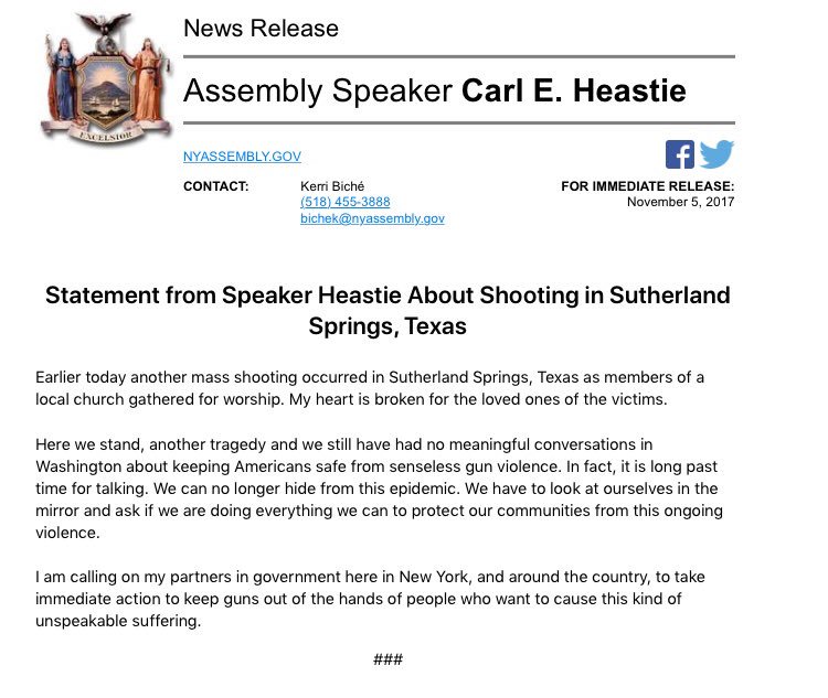 Statement from Speaker Heastie on Shooting in Sutherland Springs, Texas