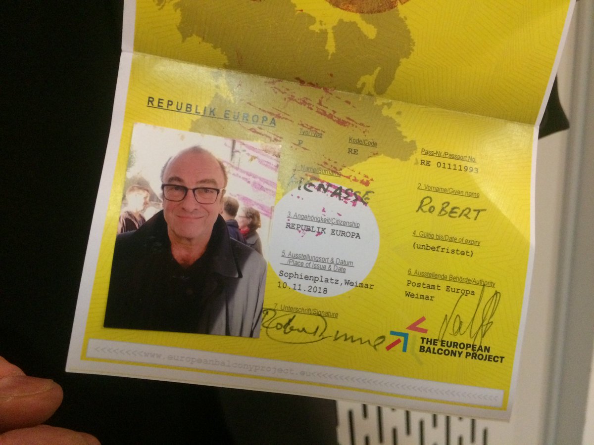 #RobertMenasse ein gelbes Dokument, ausgestellt am 10.11.2018, unter "Citizenship" steht "Republik Europa". Gemeinsam mit Richard David Precht eröffnet er heute die Europäischen#Literaturtage in Krems.#oe1kulturaktuell http://bit.ly/2BpmzIg pic.twitter.com/pGmqYzgrPb