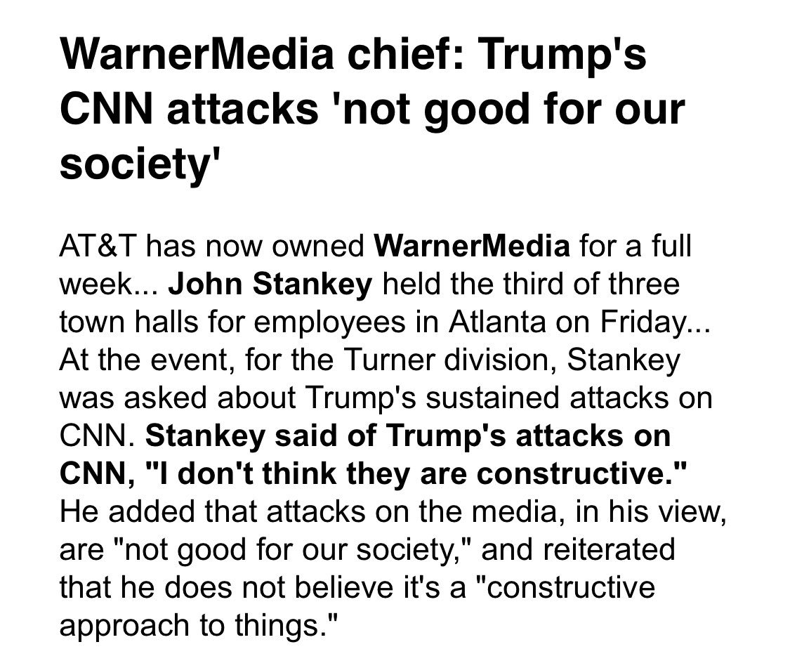 New WarnerMedia chief John Stankey held a town hall Friday morning where he responded to Trump’s attacks on CNN. He said he did not find the attacks “constructive” and added that Trump’s attacks on the media, in his view, are “not good for our society” https://mailchi.mp/cnn/rs-june-22-2018 …pic.twitter.com/z0FRgYe7xs