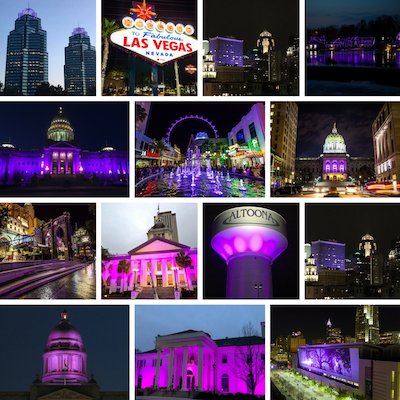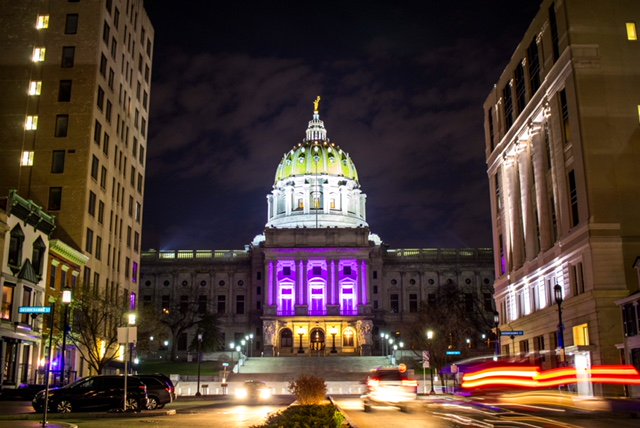 Pennsylvania's Capitol building lit up in purple in honor of