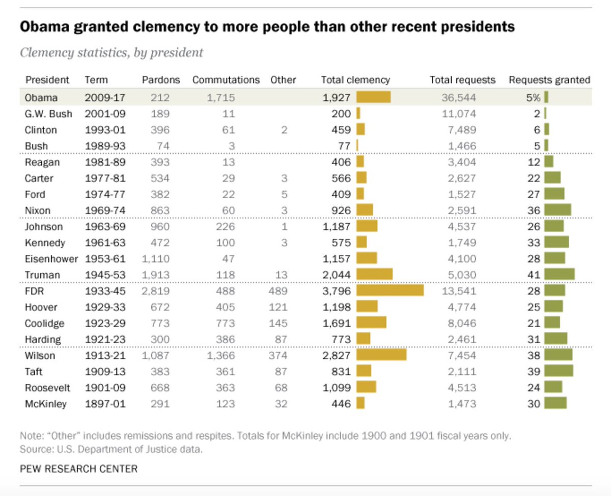 FDR granted more pardons than any other president; George HW Bush the fewest. (Trump has granted none so far.) http://pewrsr.ch/2rqpRDq pic.twitter.com/qLJbBboKq1