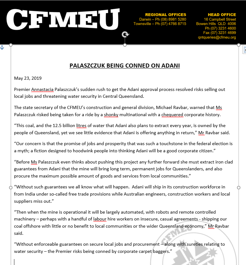 CFMEU: PALASZCZUK RISKS BEING CONNED BY ADANIpic.twitter.com/jS3tDOADoe