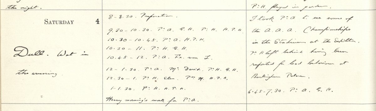 This schoolroom diary entry for 4 July 1908 records the princes' tutor taking Prince Albert [later ] to the Amateur Athletics Association Championships but '[Prince Henry] left behind having been reported for bad behaviour'