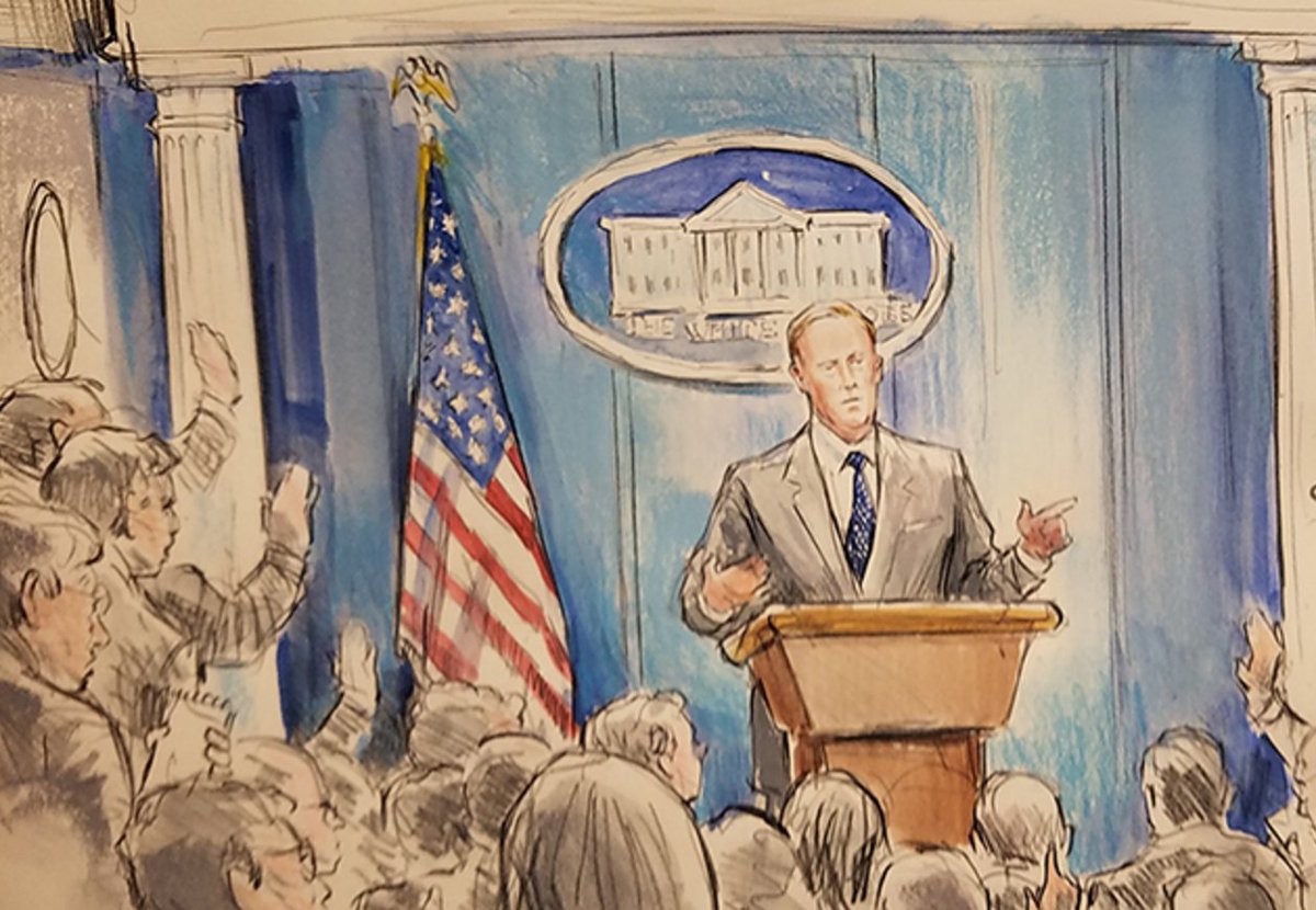 This is really happening. Because the White House is prohibiting cameras in their press briefings, CNN sent in a sketch artist. USA. 2017.