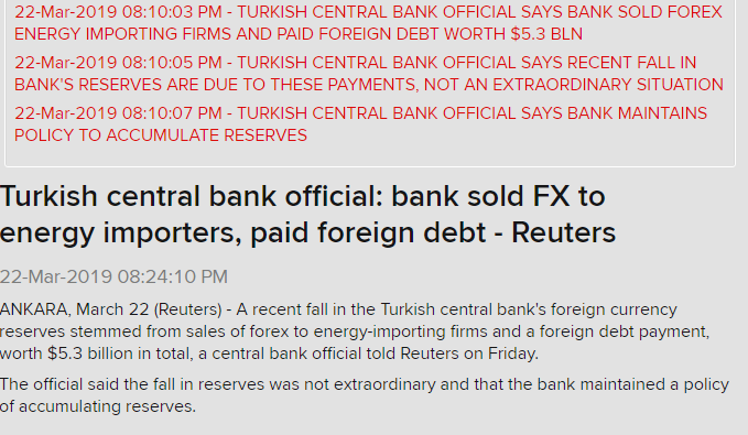 Fall in the Turkish central bank's fx due to sales of forex to energy-importing firms and a foreign debt payment, worth $5.3 billion in total, official told