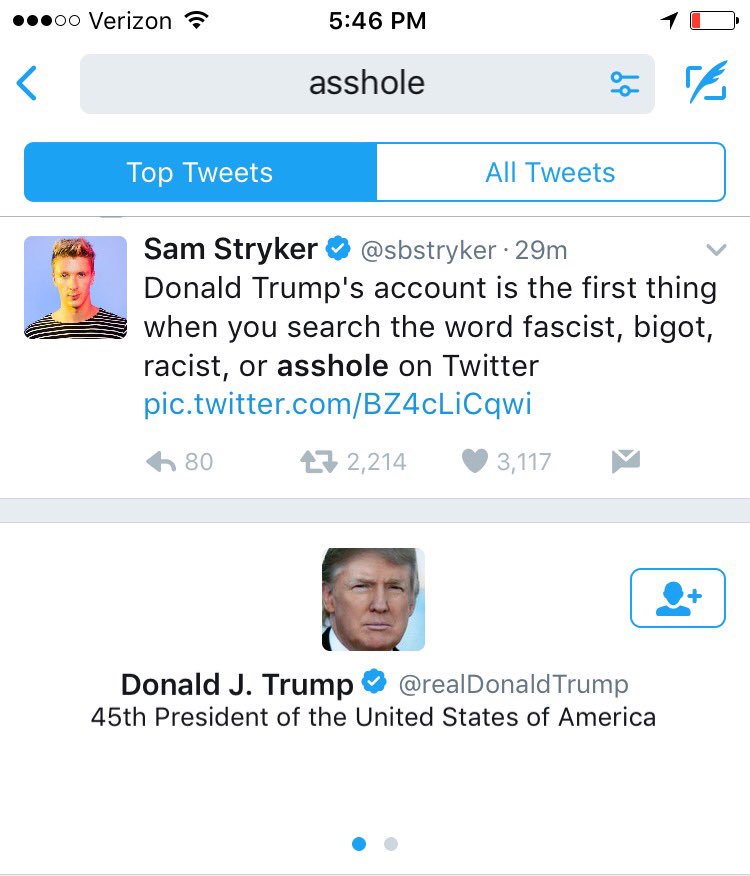 Donald Trump's account is the first thing when you search the word fascist, bigot, racist, or asshole on Twitterpic.twitter.com/BZ4cLiCqwi