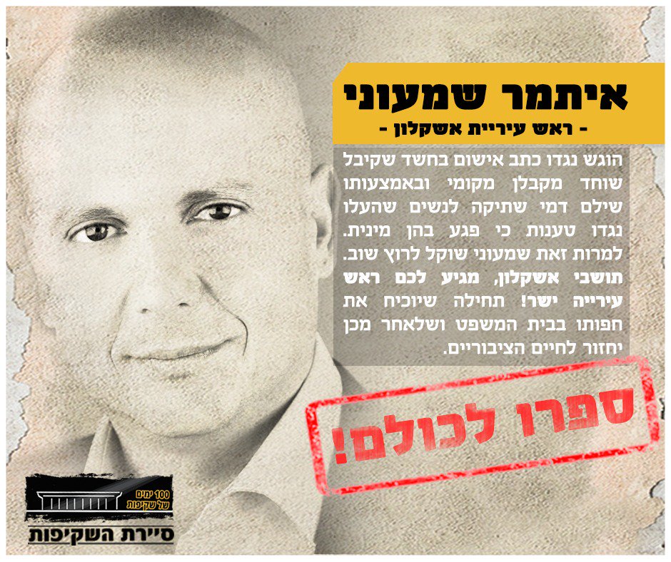 לקראת הבחירות המקומיות - ממשיכים לחטא עם אור השמש! והפעם -אשקלון! במקום שראש העיר יפרוש ויילחם על טהרת שמו לאחר שהואשם בקבלת שוחד, שמעוני מתכנן לרוץ שוב. תייגו אשקלונים ואשקלוניות בפוסט ועזרו לנו להגיע לכ-130,000 אלף תושבי אשקלון https://goo.gl/hLmnXf pic.twitter.com/egaxMmaY1m