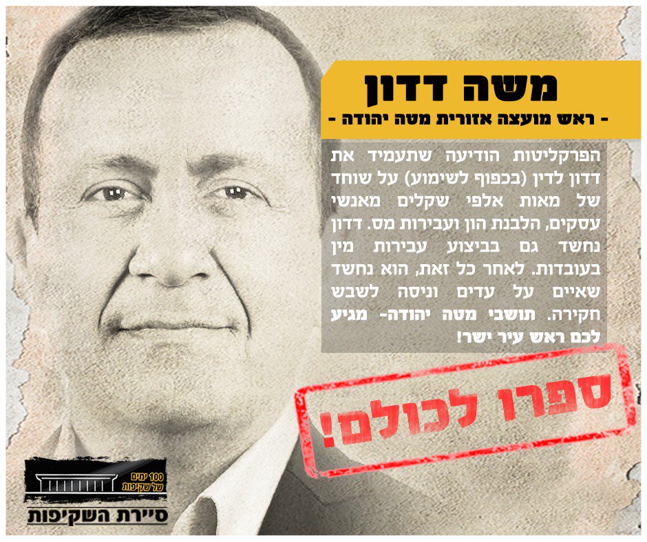 המקרה של ראש מועצת מטה יהודה, משה דדון, באמת חריג. דדון נחשד בכל כך הרבה עבירות חמורות - שחשוב במיוחד לדאוג שכל תושב ותושבת המועצה ידעו מזה. תייגו, תשלחו את התמונה בוואטאסאפ ותצייצו מחדש - שכל תושב ותושבת ידעוpic.twitter.com/ego32jgt5t