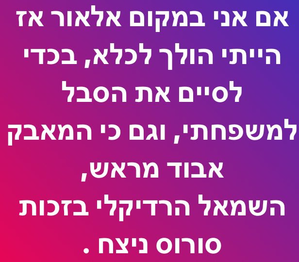אדוני ראש הממשלה. רובנו מבינים שאם יצליחו להפיל אותך בדרכים לא דמוקרטיות זה יהיה קיצה של הדמוקרטיה. הייה חזק. אל תכנע לסחיטה באיומים.העם אתך